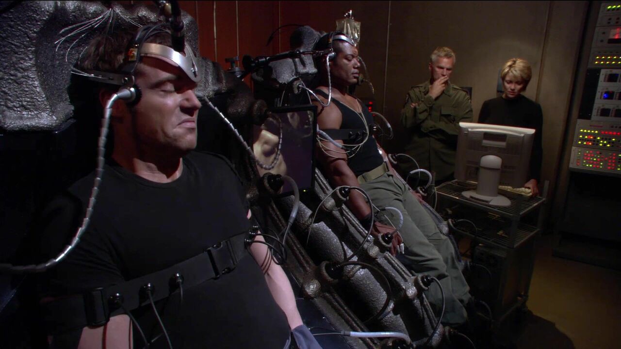 - Les fans les plus attentifs remarqueront peut-être une différence de taille dans la coiffe que porte Teal'c lorsqu'il est branché sur le jeu. En réalité, le département des accessoires a d'abord mal évalué la taille de la tête de Chris et a dû trouver une taille XXL pour les jours de tournage suivants.