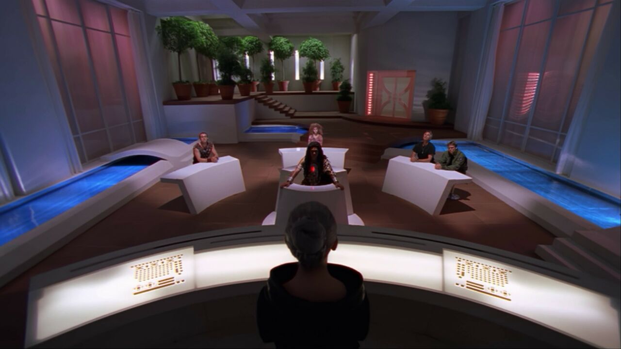 [05:32] - Le bassin d'eau que l'on peut voir devant les membres de SG-1 disparaît sur le plan large de la scène.