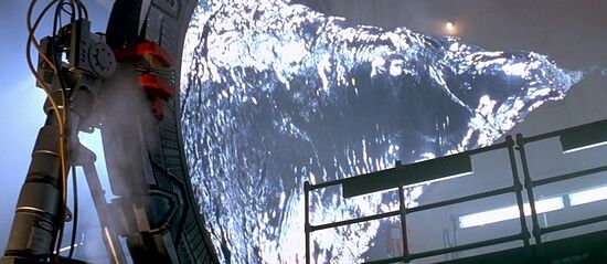 En effet, sur cette porte, aucun chevron ne s'allume, le chevron du haut est "ouvert" et chaque chevron bouge lorsqu'il est enclenché. De plus, lorsque la porte du film s'active, le vortex instable (le Kawoosh) produit également un tourbillon à l'arrière de la porte, tourbillon qui n'a pas été repris par les séries.
