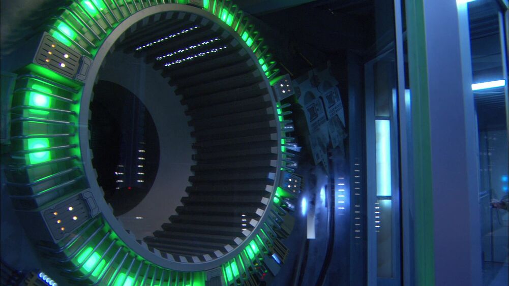 Le moteur à vortex fut découvert en 2009 par le docteur McKay peu de temps avant la bataille contre la ruche modifiée en orbite de la Terre. Néanmoins, malgré son instabilité et sa grande complexité, ce propulseur fut utilisé par le docteur Zelenka avec l'accord de Richard Woolsey afin de rejoindre la Terre le plus rapidement possible, et ce en dépit des risques pour la cité et l'ensemble de son personnel.