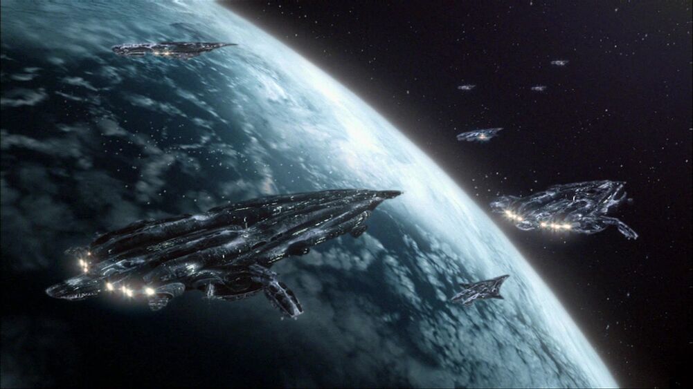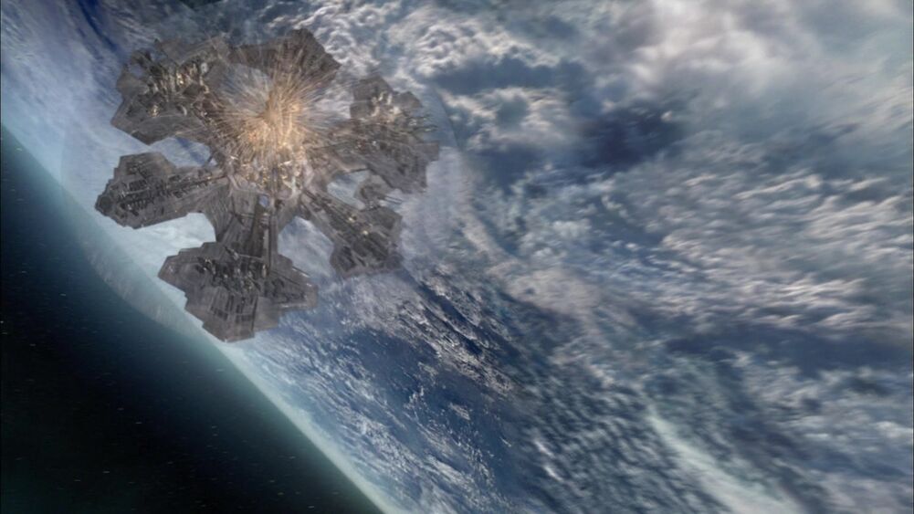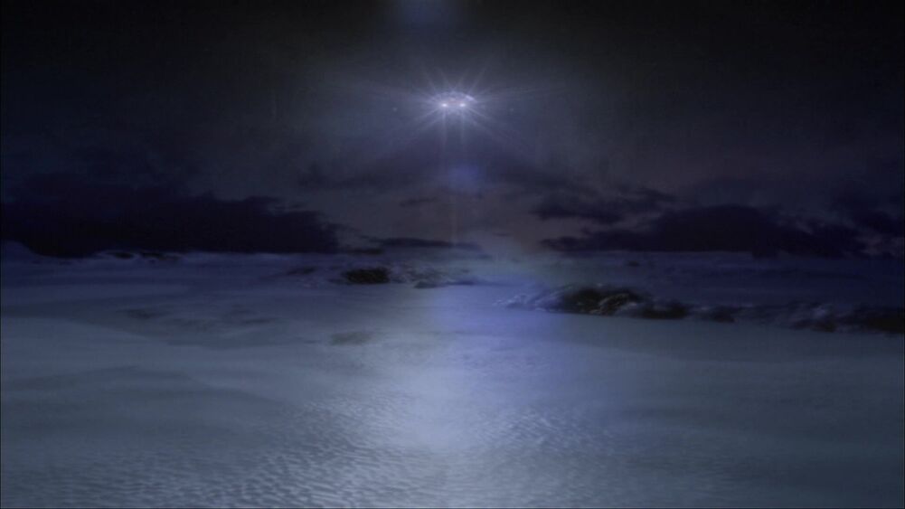 Ainsi, au moment où le vaisseau-ruche modifié se plaça en orbite de la Terre et chargea ses armes principales, Atlantis fut instantanément propulsée en orbite de ce monde grâce au moteur à vortex et se retrouva au milieu d'une bataille spatiale. Le docteur Beckett déploya alors une importante vague de drones sur le vaisseau ennemi qui riposta en envoyant une salve de puissants tirs d'armes à énergie, repoussant la cité à la limite de l'atmosphère terrestre. Cependant, n'ayant pas assez de puissance pour manœuvrer la cité, Woolsey ordonna à Beckett de continuer à tirer sur le vaisseau ennemi en dépit du bouclier d'Atlantis qui fut sur le point de céder. Ainsi, malgré la destruction de la super-ruche, le docteur Beckett fut incapable de réajuster l'orbite d'Atlantis qui entra dans l'atmosphère de la Terre. Le personnel de l'expédition parvint néanmoins à activer l'occulteur avant que la cité ne se pose dans la baie de San Francisco.