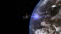 Cependant, une fois arrivé en orbite de P3X-744, une réaction en chaîne incontrôlable résultant de la brève activation de l'hyperespace survint dans le réacteur à naquadria du Prométhée et menaça de détruire le vaisseau terrien. Ayant moins d'une minute avant la surcharge fatale, le colonel Ronson ordonna au major Grant de procéder au largage immédiat du réacteur dans l'espace puis de s'éloigner le plus vite possible à l'aide des propulseurs subluminiques avant l'explosion. Néanmoins, la destruction du réacteur à naquadria engendra une violente impulsion électromagnétique qui endommagea le vaisseau terrien, ainsi que les installations situées à la surface de la planète. Les habitants de Tagrea ripostèrent alors en déployant deux missiles balistiques, pensant subir une attaque de la part des Terriens, qui se dirigèrent à toute vitesse vers le Prométhée.