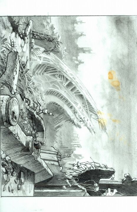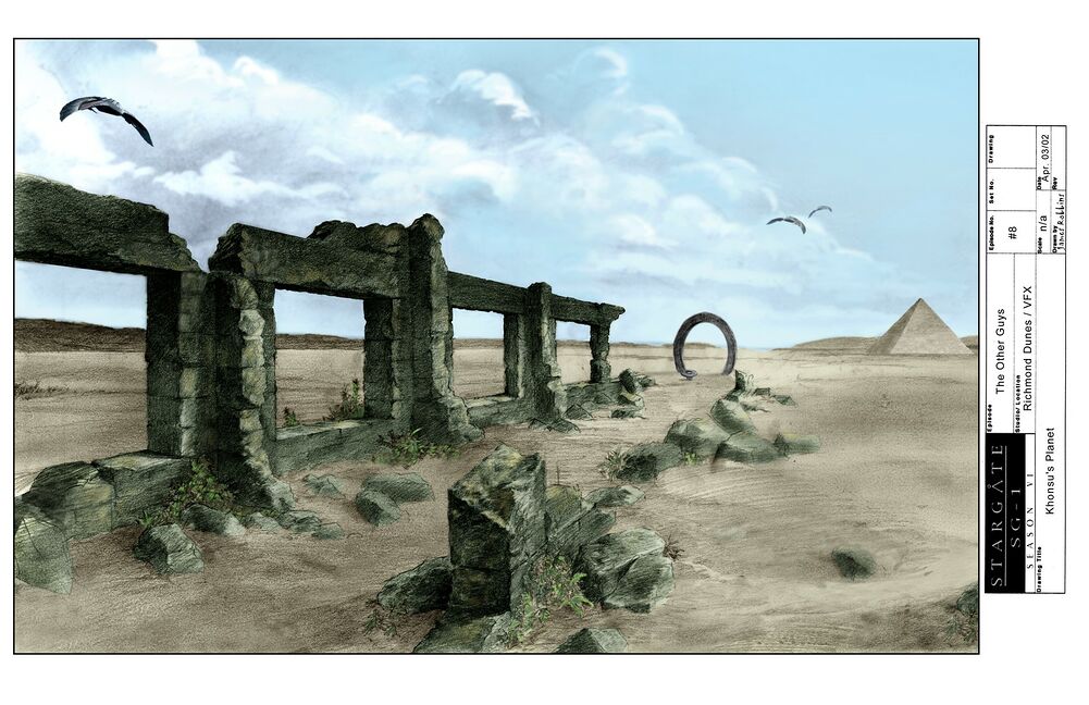 Ce premier artwork nous présente une scène tirée de la pré-production de l'épisode Une dimension trop réelle (saison 1) dans laquelle les membres de l'équipe SG-1 explorent la planète P3R-223, un monde dévasté par les Goa'ulds où le docteur Jackson découvre le miroir quantique. D'après ce dessin préparatoire, il était apparemment prévu que Teal'c trouve une écoutille et sorte d'une base souterraine, découvrant un paysage apocalyptique composé d'une ville technologiquement avancée entièrement détruite. Cette scène fut sans doute abandonnée pour des raisons budgétaires ou par manque de temps, ou tout simplement parce qu'elle ne s'incluait pas dans la timeline de l'épisode, et ne fut donc probablement jamais tournée.