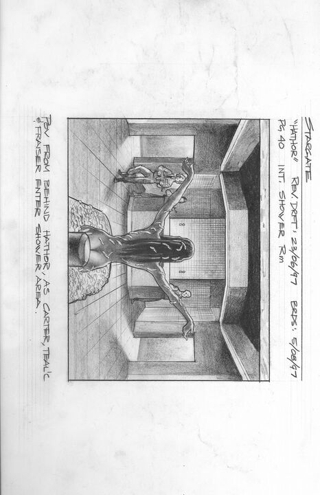Plus tard, une autre image publiée par Mallozzi révèle également une scène sexy avec le personnage d'Hathor dans la baignoire grouillant de larves goa'ulds. En effet, à cette époque, Showtime, le premier diffuseur américain de la série, n'avait de cesse de chercher de nouvelles occasions de repousser les limites de la censure avec sa nouvelle émission de science-fiction. Cet état de fait a commencé avec la scène de nudité de Sha're dans l'épisode pilote, et il est donc logique que la production de la série ait envisagé d'autres moments sexy au cours de ces premiers jours, et notamment avec la déesse Hathor. Toutefois, ces derniers ont finalement renoncé à intégrer ce caractère sexuel à la série pour se concentrer sur une aventure plus familiale.