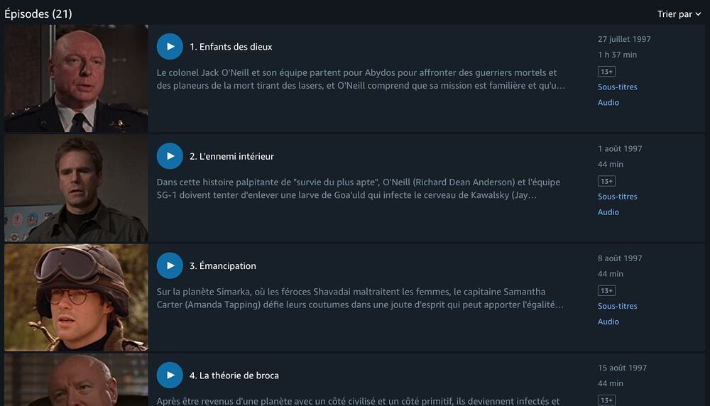 Cependant, depuis quelques mois, les choses semblent évoluer dans le bon sens. En effet, Prime Video propose désormais sur son catalogue français la plupart des épisodes de la franchise Stargate. Tous les épisodes ne sont toutefois pas encore disponibles. En effet, il semblerait que la plateforme ajoute au compte goutte les épisodes et les saisons qui manquent à son catalogue. À l'heure où nous écrivons ces lignes, sont notamment disponibles :