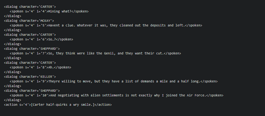 C'est ainsi qu'en utilisant ces différents modèles, le système d'IA a pu géréner des lignes de script correspondant à des dialogues entre les personnages, mais aussi des descriptions intercalées entre les répliques ainsi que les lieux dans lesquels ces dialogues pourraient se tenir. Tout ceci en s'attachant à rendre le résultat aussi fidèle que possible à l'esprit des anciens épisodes des séries qui ont été écrit par des scénaristes en chair et en os.