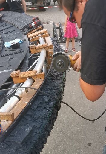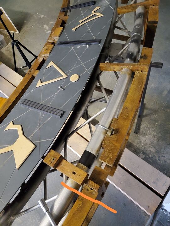 Après donc une nouvelle nuit blanche pour les plus acharnés, le chantier a pu reprendre le dimanche 28 pour finaliser l'assemblage des panneaux (chevrons, cristaux et grands V) avec la découpe de certaine parties pour laisser la place au système de fixation de la Porte sur son futur support. Pourtant, à la mi-journée, malgré ces nombreuses heures de travail, les bénévoles se sont rendus à l'évidence : la Porte ne pourrait pas être achevée. Il a manqué de temps pour la fixation des chevrons arrières et pour les ailettes de chaque côté des chevrons. Pour les mêmes raisons il avait été décidé, quelques semaines plus tôt, de reporter la mise en place du système de rotation de la glyphtrack et la possibilité d'actionner le chevron principal.