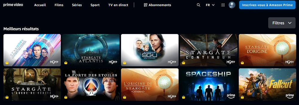 Seul le film Stargate, la porte des étoiles est accessible directement dans le catalogue général Prime Video via sa chaîne de télévision Action, à l'achat ou à la location.
