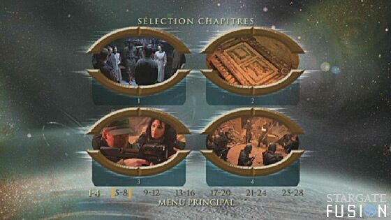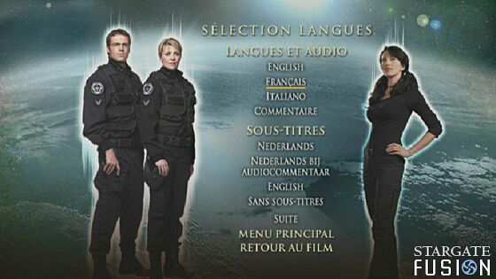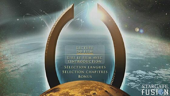 Sur fond d'une vue de l'espace de la planète Terre, les menus sont très agréables à regarder. La navigation est claire et permet d'accéder facilement au film, aux bonus et au choix de la langue et des sous-titres. Tout cela se faisant sur une musique douce dans l'esprit « Stargate ».