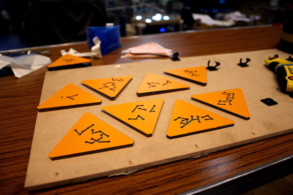 Les éclairages sont faits de bandes de LED, il y en a trois sous chaque glyphe ainsi que deux sous chaque chevron, plus six carrés de quatre LED de puissance sous chaque cristal. Ce qui nous donne 126 bandes et 54 carrés au total. Petite anecdote : les bandes de LED sous les glyphes sont collées sur des barquettes de cuisson en aluminium utilisées comme réflecteurs pour la lumière !
