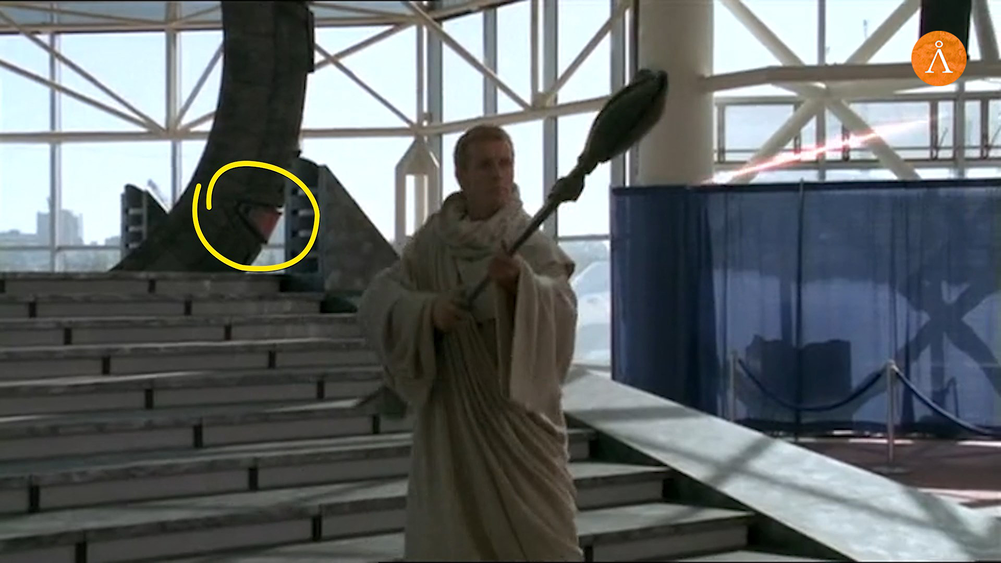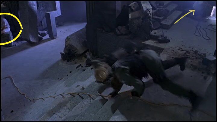 C'est précisément dans cette séance que se trouve le faux-raccord ! En effet, si on effetue un ralenti sur image au moment où le colonel O'Neill attrape le capitaine Carter et se jette dans les escaliers pour éviter une chute de pierres, on peut voir deux techniciens en short assis au milieu des décors, ces derniers ayant vraisemblablement oublié que la caméra tournait à ce moment là.