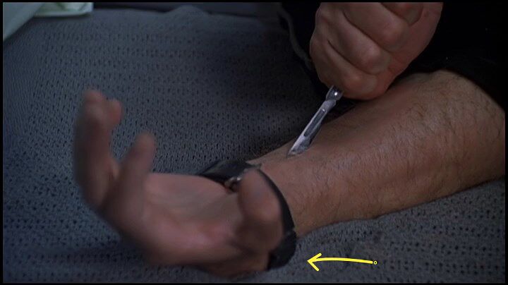 En réalité, cet effet spéciaux est réalisé à partir d'un trou dans le lit de l'infirmerie et de la main d'un technicien caché sous ce dernier. La montre porté par Richard Dean Anderson sert de liaison entre la prothèse du bras du colonel O'Neill et la main du technicien.