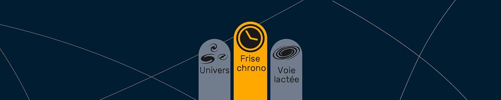 La frise est contruite autour de trois colonnes verticales positionnées au centre de l'image. La colonne jaune représente la ligne du temps avec les dates et les indications temporelles. Les deux colonnes grises permettent de nous situer dans l'espace : à droite tout ce qui se passe dans la Voie lactée, à gauche tout ce qui se passe dans le reste de l'univers.