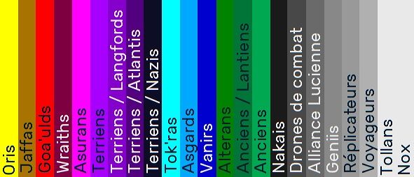 À gauche et à droite des trois colonnes, on retrouve tous les événements relatifs aux différentes cultures de Stargate. Pour les différencier, les étiquettes de chaque événement ont un code couleur :