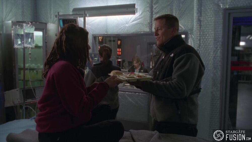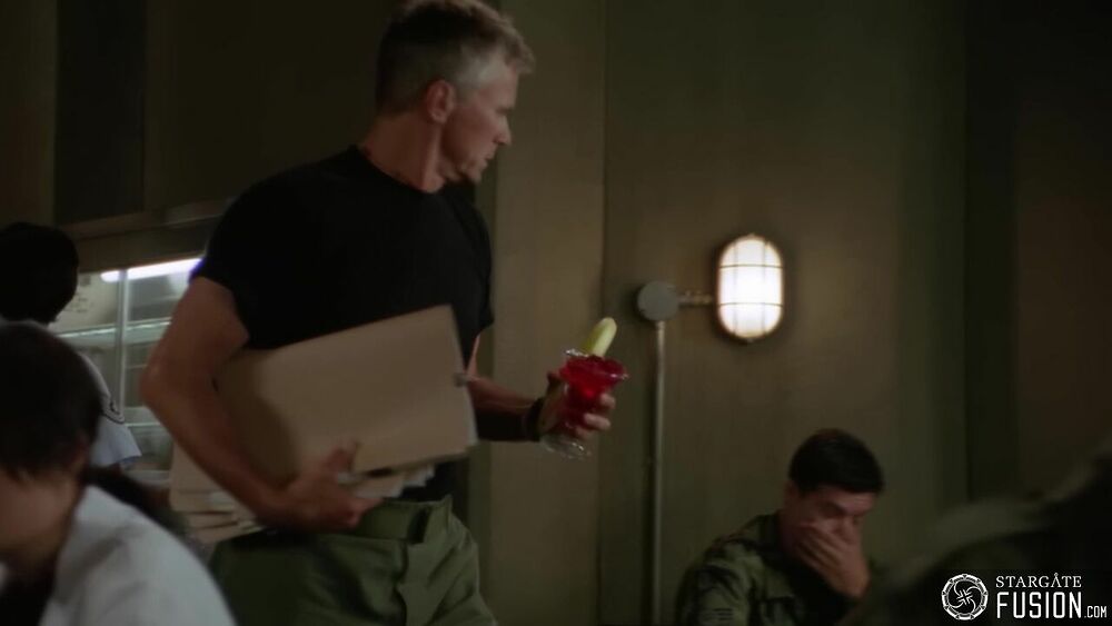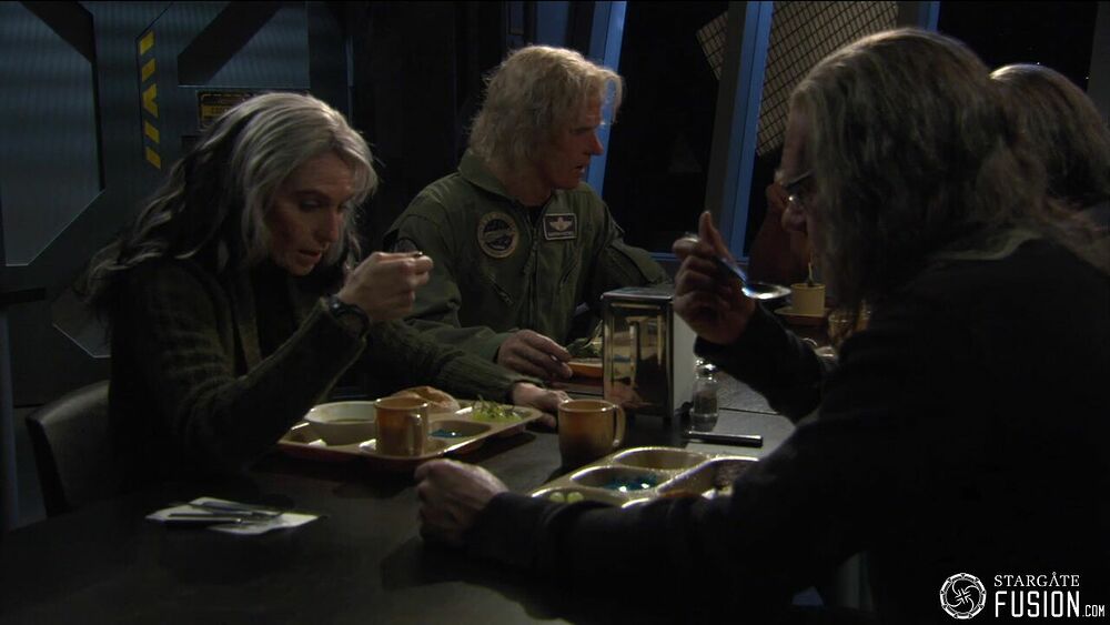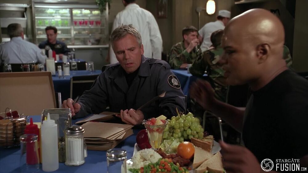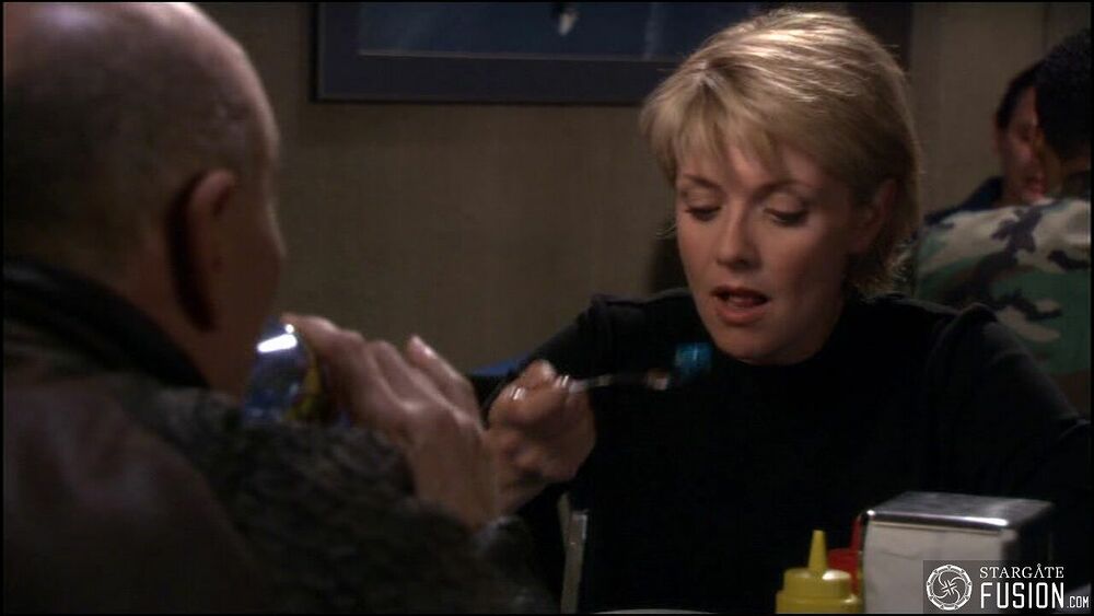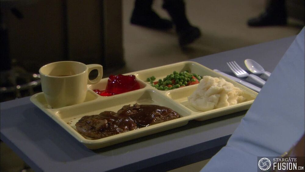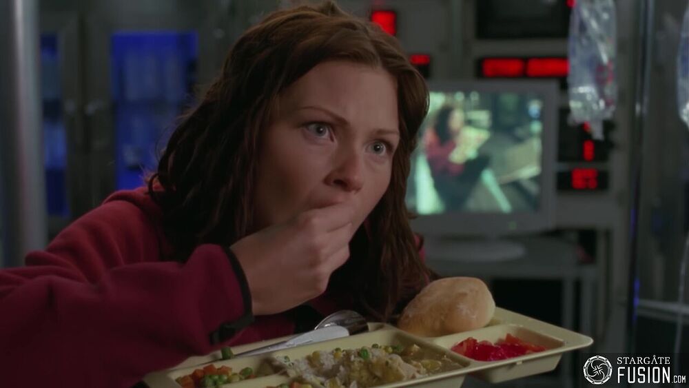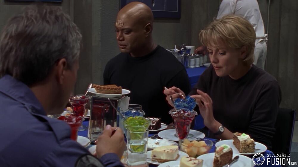Pourtant grande consommatrice de gelée, Sam préferera ici s'en passer pour son repas avec Teal'c et Jonas au mess.