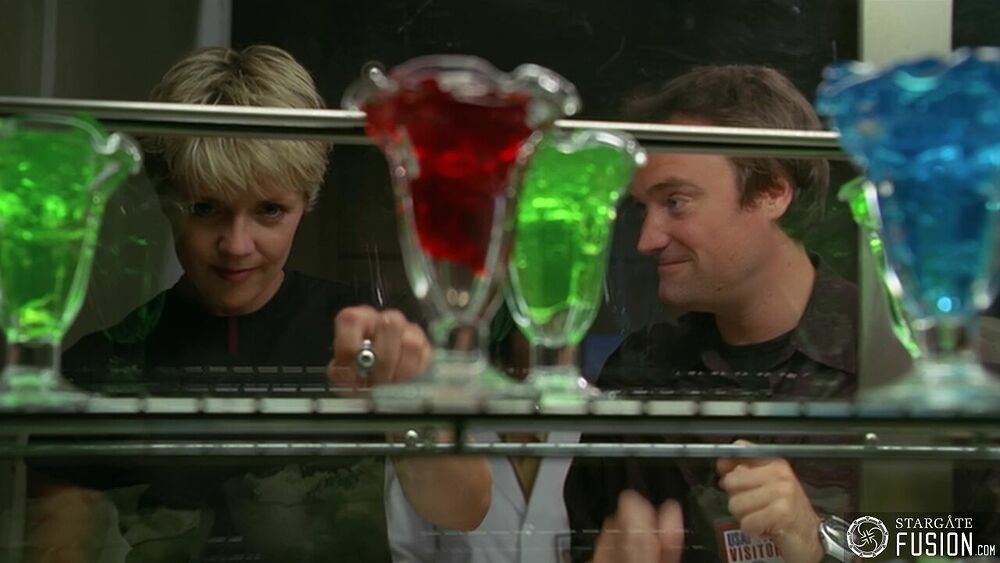 Les desserts colorés ne font plus que de la figuration dans cet épisode avec ici Sam et Teal'c qui parlent devant une vitrine pleine de coupes de gelée.