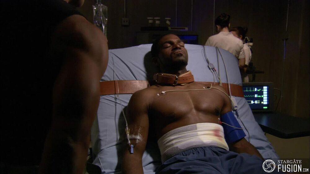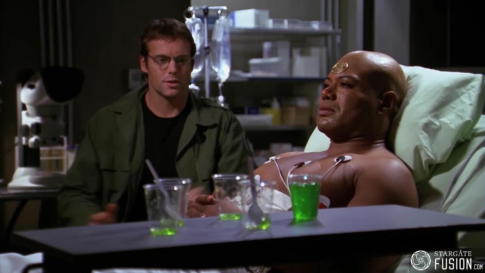 Le plateau repas est servi à l'infirmerie du SGC pour le Sodan Volnek. Visiblement peu coopératif, il ne touchera pas à sa gelée.