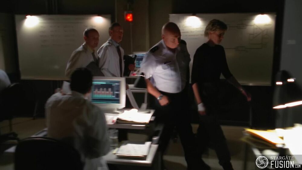 Un tout petit peu plus tard dans l'épisode, plusieurs militaires arrêtent le lieutenant Evans qui sort du mess du SGC avec un plateau repas et son dessert en gelée rouge. Ils veulent l'interroger car elle a été temporairement l'hôte d'Anubis. À moins que ça ne soit pour lui piquer son plateau...
