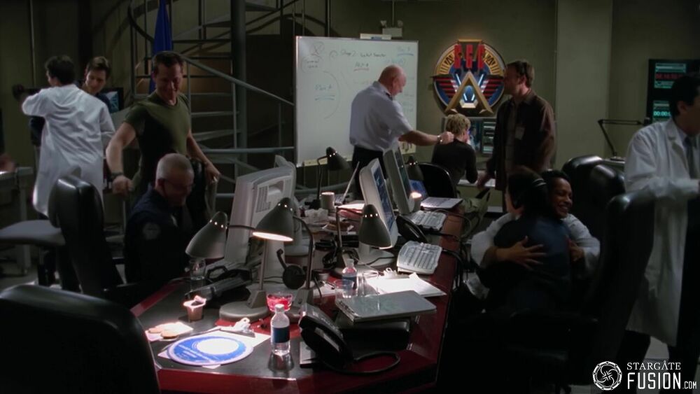 Retour au mess du SGC avec un alignement de coupe de gelée en arrière plan du Dr Fraiser.