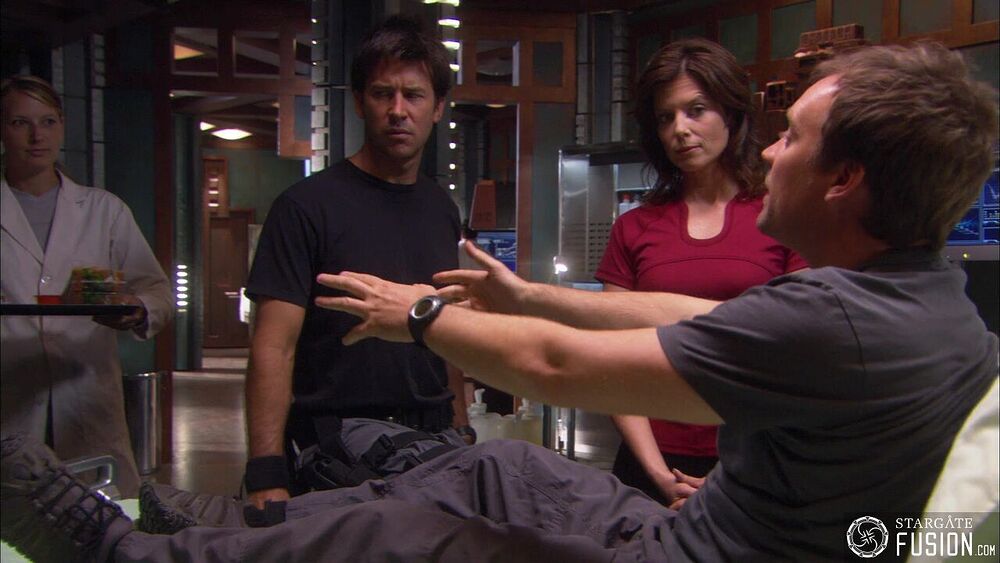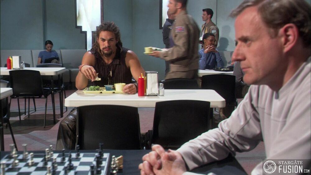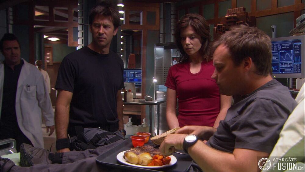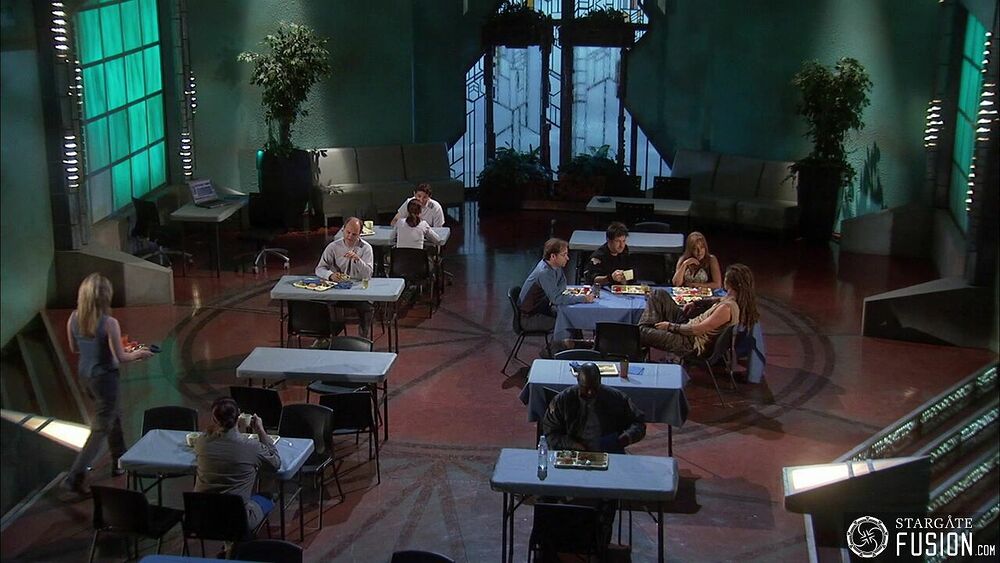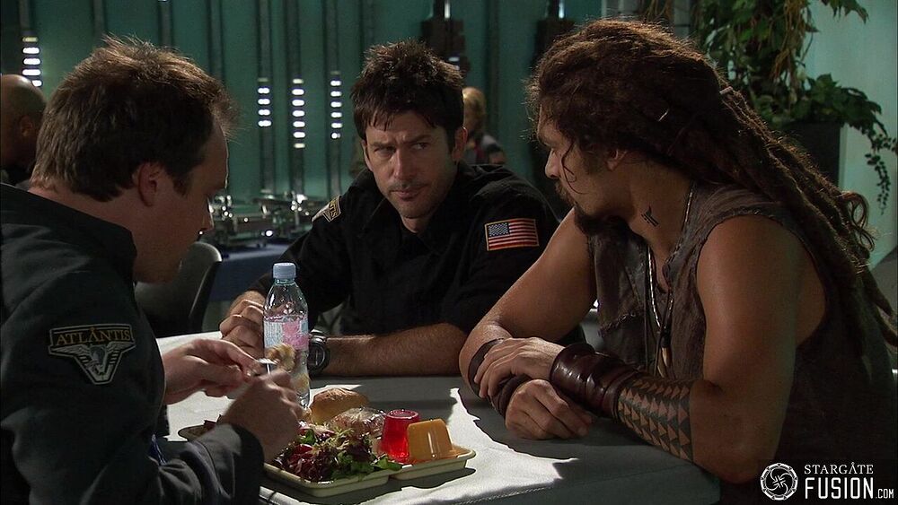 Lors d'une discussion informelle dont ils ont le secret, les membres de l'équipe de Sheppard se retrouvent au mess autour d'un plateau repas contenant de la gelée.