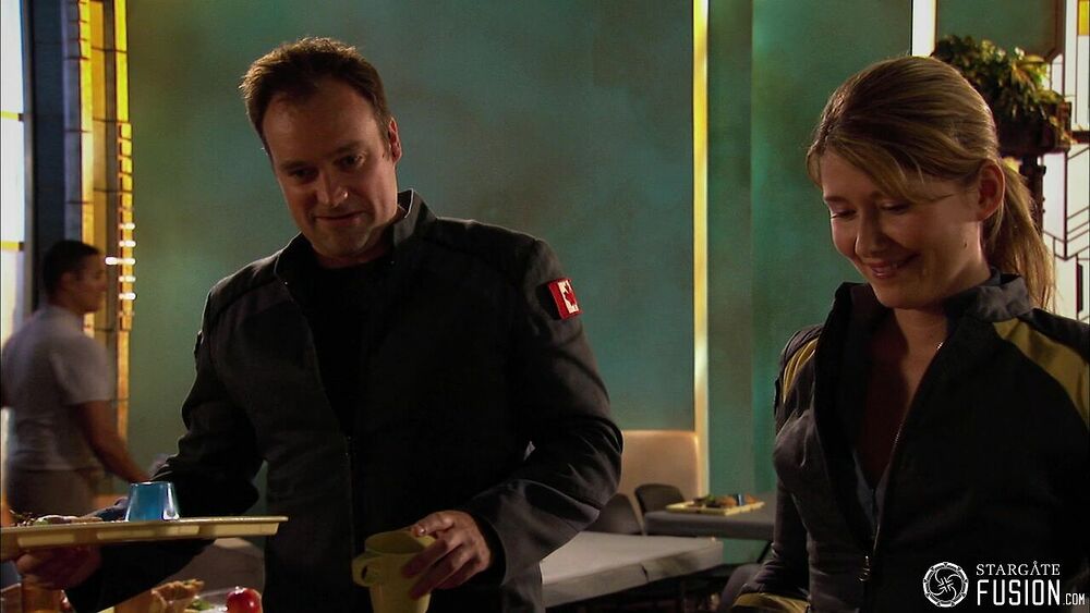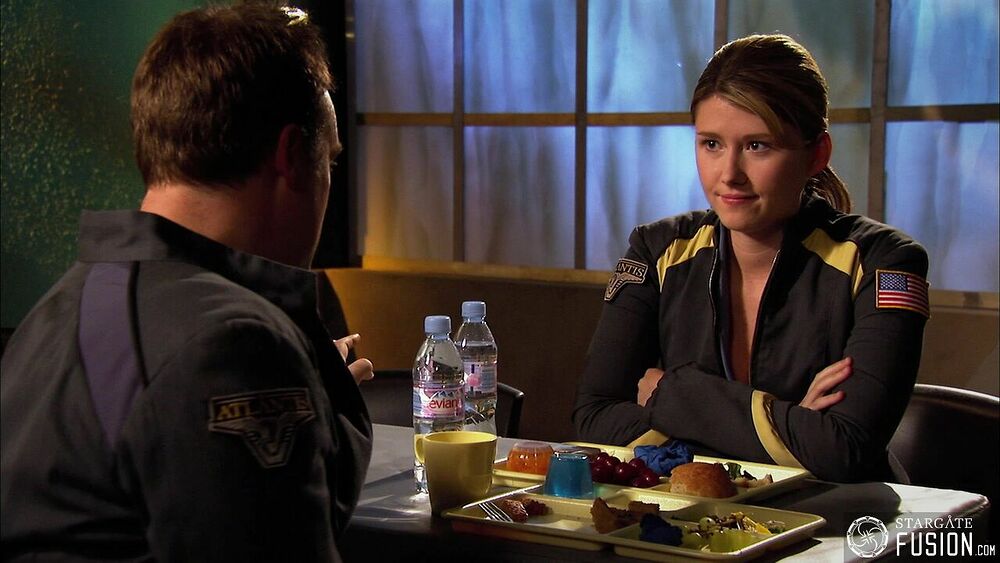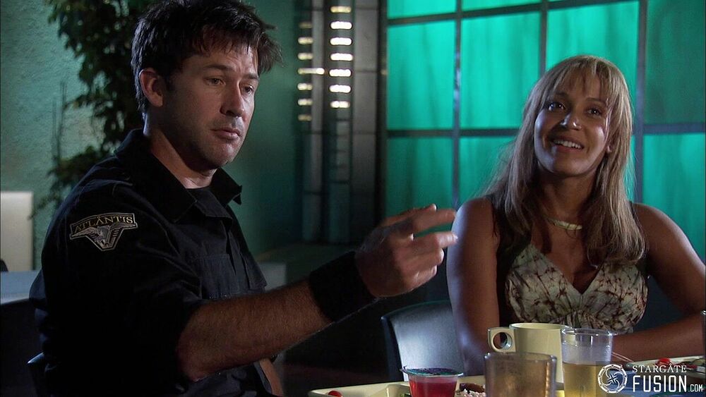 Lors de leur tête-à-tête au mess d'Atlantis, McKay et Keller prennent un repas autour d'une gelée bleue.