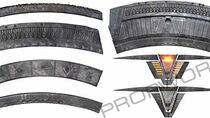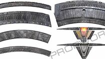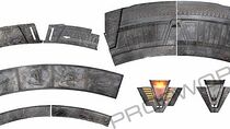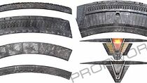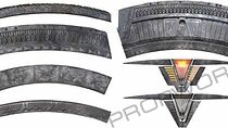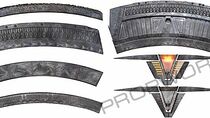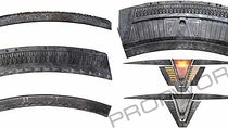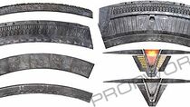Fabrication de composants en résine appliqués sur fibre de verre peints en gris, avec de nombreux trous percés en production. Pièce en plastique avec cinq glyphes en plastique et des accents en caoutchouc. Deux symboles en forme de V en résine rouge claire et gris peint. L'une montre des signes de réparation précédente. Deux chevrons identiques avec des corps extérieurs en résine et un noyau en résine claire.