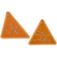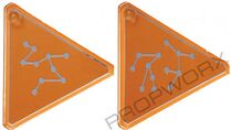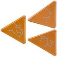 Ensemble de deux panneaux triangulaires en acrylique de production avec des autocollants en bronze et en argent montrant des symboles de constellation avec des boutons en caoutchouc transparent sur un coin, chaque mesure environ. 4 po x 3,5 po x 0.5 po.