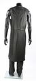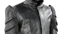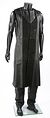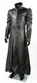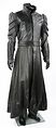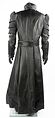 Le costume noir se compose d'une longue veste, d'un long gilet, d'une paire de pantalons en cuir, d'une paire de gantelets et d'une ceinture. Fabriqué principalement en cuir souple, le manteau présente des panneaux texturés en couches sur le haut des manches, ce qui donne de la forme à l'épaule. Un satin bleu foncé a été utilisé pour la doublure du vêtement et la veste se ferme à l'aide de boutons-pression cachés et de pinces à crochets. Une étiquette portant la mention « Cody Laudan » a été fixée à l'encolure.