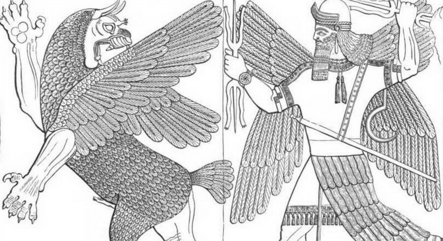 Fils aîné du dieu Ea, ou Enki, et de la déesse Damkina, Marduk était le champion d'une nouvelle génération de dieux qui représente la vie, le progrès, la civilisation, tandis que les dieux primordiaux, Tiamat et Apsou, incarnaient le chaos primitif, la nature inorganisée des choses. C'est alors que Mardouk créa les vents et souleva la tempête, provoquant ainsi la colère des anciens dieux.