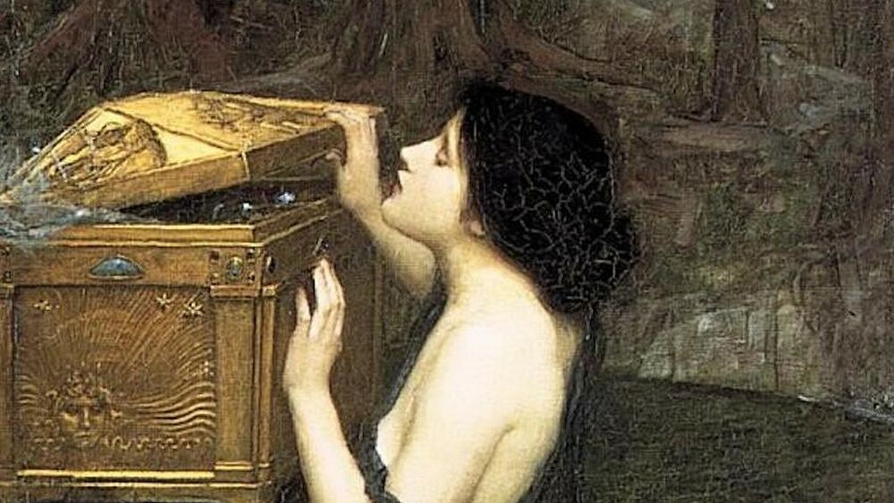 Le mythe de cette toute première femme est indissociable de celui de la « boîte de Pandore », cadeau de Zeus, qui serait en réalité une jarre et qui contenait tous les maux de l'humanité comme la guerre, la maladie, la famine ou encore la mort.