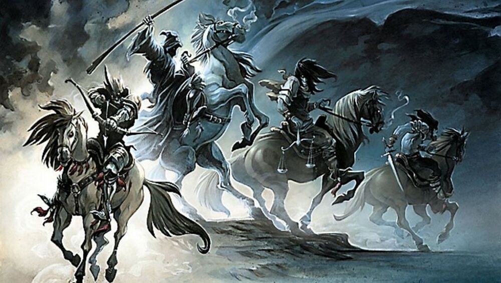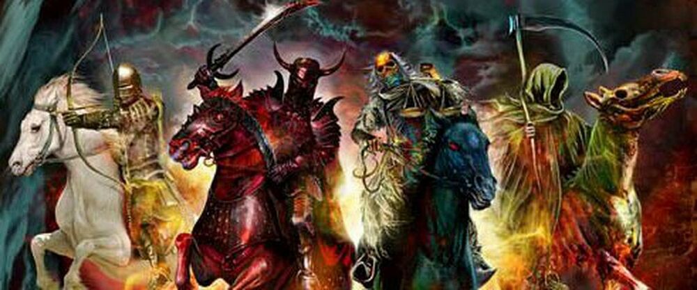 Et quand l'Agneau eut ouvert le quatrième sceau, j'entendis la voix du quatrième animal, qui disait : Viens, et vois. Et je regardai, et je vis paraître un cheval de couleur pâle ; et celui qui était monté dessus se nommait la Mort, et l'Enfer le suivait ; et le pouvoir leur fut donné sur la quatrième partie de la terre, pour faire mourir les hommes par l'épée, par la famine, par la mortalité, et par les bêtes sauvages de la terre. » - Nouveau Testament, Apocalypse chapitre 6