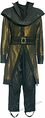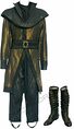 Costume fabriqué en série composé de : robe en taffetas or et noir avec garniture en faux stingray, poignets en cuir noir motif reptile, et fermeture avant Velcro. Pantalon noir en polyester à motifs avec bouton avant et fermeture à glissière et étriers élastiques verts. Collier noir en faux stingray avec fermeture éclair au dos. Collier noir en cuir motif reptile avec col fendu à l'avant. Ceinture à motif reptile noir avec garniture en daim noir, boucle en métal bronze, garniture en faux stingray et fermeture velcro. Aucune information sur la taille n'est disponible. Les pièces de costumes sont toutes produites avec la mention "APOPHIS #1" à l'intérieur ou au dos. Inclus sont une paire de bottes en cuir brun avec un revêtement en cuir noir métallique, sans taille.