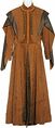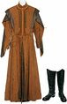 Production de surveste en coton et soie brun avec coutures brunes ornées, boutons en métal et fermoir en métal à l'avant. Comprend une paire de pantalon en cuir noir avec fermoir à l'avant et ceinture en cuir noir. Aucune information de taille disponible. Comprend une paire de bottes en cuir noir avec semelle en caoutchouc. Taille 11.