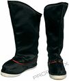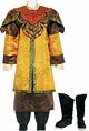 Production faite haut et pantalon en coton brun orné, avec des détails complexes, pantalon cravate et col brun clair. Costume comprend sous-veste en coton jaune et soie avec coutures vertes et or et coton rouge renversé avec passepoil rouge et vert, vert motif de laisser et orné brun et vert sous-doublure. Pas de taille. Chaussures de tennis avec des bottes en polyester noir attachées, taille 9.