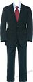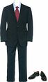 Veste et pantalon tailleur tailleur en laine bleu foncé sur mesure pour homme. Chemise en coton bleu, taille 16 1/2 - 34. Costume et chemise fabriqués au Canada par J.P. Tilford. Ceinture en cuir noir avec boucle en métal argenté, taille 38. Cravate en soie rouge et bleue, fabriquée en Italie par Faconnable. Inclus sont une paire de chaussures en cuir noir avec des lacets noirs, taille 9.5.