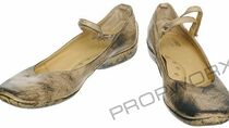 Robe en coton beige fabriquée en série avec bordure ruban beige, détails de bouton beige et fermeture à glissière au dos, aucune information de taille n'est disponible, la robe est recouverte de stries noires. Inclus sont une paire de slip très en détresse sur tan et chaussures noires avec semelle en caoutchouc, aucune taille.