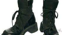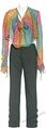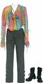 Production faite paire de pantalon en tweed noir clair, avec zip à l'avant et trois fermoirs en métal sur chaque jambe de pantalon. Comprend blouse rouge, vert, bleu et violet avec attaches. Bottes en cuir noir, taille indisponible, production marquée "MILA" à l'intérieur.