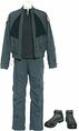 Costume de production composé de : veste de style Atlantis gris avec des panneaux noirs, panneaux zippés gris dans la poitrine, patch drapeau américain sur la manche gauche, patch Atlantis sur la manche droite, les deux patchs attachés avec Velcro, la production marquée "LT CADMAN" poche intérieure. Chemise en tricot en polyester et lycra gris foncé avec fermeture éclair devant. Pantalon de style Atlantis gris, production marquée "(4) LT. CADMAN" à l'intérieur. Aucune information de taille n'est disponible. Bottes de randonnée en cuir noir et gris, taille 9, fabriquées par Hi-Tec.