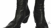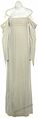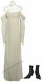 Robe en velours blanc fabriquée en série avec corset/soutien-gorge intégré, maillot de corps en spandex vert intérieur et fermeture éclair au dos, la robe est affligée de stries et éclaboussures noires. Aucune information de taille n'est disponible. Inclus sont une paire de talons hauts en cuir noir avec semelle en caoutchouc, aucune taille.