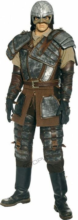 Costume fabriqué en série composé de : tunique en laine et cuir brun avec côtés à lacets, panneaux en cuir brun et panneaux d'épaule en cuir argenté, médaillons en résine décorative peinte en argent, et armure sous vide en plastique peint en argent, taille 46. Longs gants en cuir noir et marron avec fermeture en dentelle et boucle et détails en cuir et métal, production marquée "XLARGE" à l'intérieur.