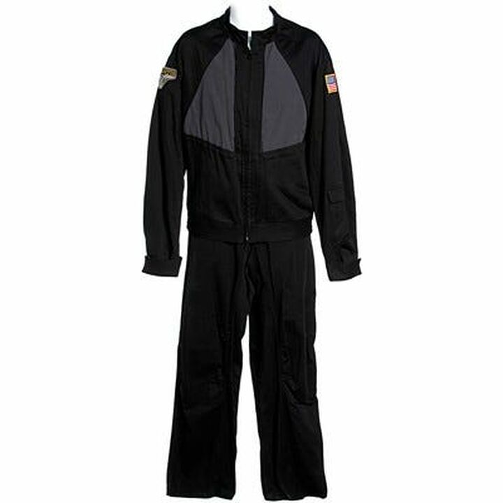 Costume de production composé de : veste de style Atlantis noir avec des panneaux gris, patch drapeau américain sur la manche gauche, patch Atlantis sur la manche droite, les deux patchs dos avec Velcro, taille 44. Pantalon de style Atlantis noir avec sangle intégrée, taille L.