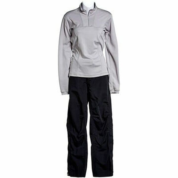Costume de production composé de : polyester gris à manches longues et Lycra chemise en tricot athlétique avec col zippé, informations sur la taille n'est pas disponible. Pantalon de style Atlantis gris avec sangle intégrée, taille S 30-31 INS 32.