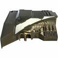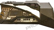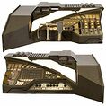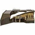 Tableau de bord en bois de production peint bronze antique avec des reflets vert foncé avec des panneaux de bord en acrylique dépoli avec des décalcomanies en bronze donnant l'apparence de nombreux boutons et commandes, a également dix commutateurs de cadran, quatre curseurs magnétiques, trois leviers en bronze, et un empiècement de contrôle en bronze avec des poignées en caoutchouc noir et un bouton de déclenchement faux, il y a aussi deux panneaux en acrylique givré avec des détails de ligne gravés sur le dessus de la face du tableau de bord, les panneaux en bronze et givré sont rétro-éclairés lorsque le tableau de bord est branché, la fonctionnalité est vérifiée, il y a aussi plusieurs lumières rendues non fonctionnelles par la production, mesures environ. 54,75 po x 43,25 po x 14,75 po.