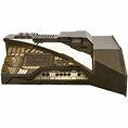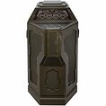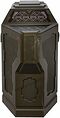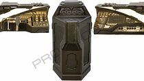 Armoire de production en bois avec boîte avant en forme de coin, face inclinée et bords supérieurs inclinés, peint vert olive avec des panneaux encastrés noirs sur les côtés de la boîte de coin, sur la face inclinée et la boîte de coin sont des évidements à l'intérieur qui sont des panneaux acryliques soutenus par un cuivre et un autocollant de maille noire, des trous triangulaires sont coupés dans les panneaux et il y a des boutons acryliques triangulaires avec des autocollants de constellation de bronze sur leur visage, il y a aussi un bouton acrylique rectangulaire sur la boîte de coin, à l'intérieur sont LED non fonctionnelles derrière les boutons, armoire est ouverte dans le dos et sur le côté droit, mesures environ. 65,5 po x 24,25 po x 40,5 po.