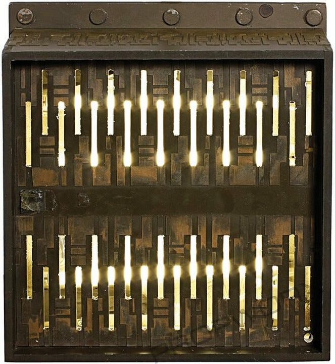 Boîte en MDF de production peinte en bronze avec patine turquoise avec panneau à fentes encastré avec 36 fentes, lumières intérieures s'allument lorsque l'accessoire est branché, la fonctionnalité est vérifiée, la boîte est couverte sur trois côtés et à l'intérieur de la niche avec des décorations laminées, lèvre avant de la boîte a cinq aimants, l'arrière de la boîte a un trou de 1in, mesure environ. 15,25 x 14,75 x 6,25 po.