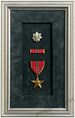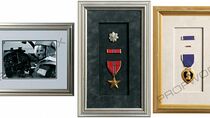 Production en noir et blanc photographie à l'intérieur cadre en métal argenté derrière verre avec gris mat et fil de suspension arrière, mesures environ. 11,5 po x 9,5 po x 75 po. Médaille, ruban et épingle de rang encadrés à l'intérieur d'un cadre en bois argenté avec tapis de velours gris et fil suspendu au dos, mesures environ. 7,75 po x 12,25 po x 1 po, production marquée « Oneils above cradenza third row from left - upper » au verso. Médaille, ruban et épingle à ruban encadrés à l'intérieur d'un cadre en bois doré avec tapis de velours beige et fil suspendu au dos, mesures environ. 7.75in x 11.5in x 1in, production marquée "Oneil's above cradenza upper left" au dos.