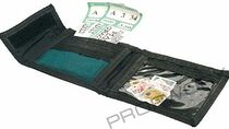 Carte de crédit en plastique vert fabriquée en production, mesure environ 3,5 po x 2,25 po. Portefeuille en toile verte avec garniture noire et fermetures Velcro, contient deux talons de production de billets de cinéma et huit timbres-poste, mesures environ. 4,75 po x 3,75 po x 5 po.
