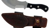 Couteau fabriqué en métal avec manche en plastique noir dur. Comprend une gaine en cuir brun avec bracelet en cuir. Mesure 11.5in de long.