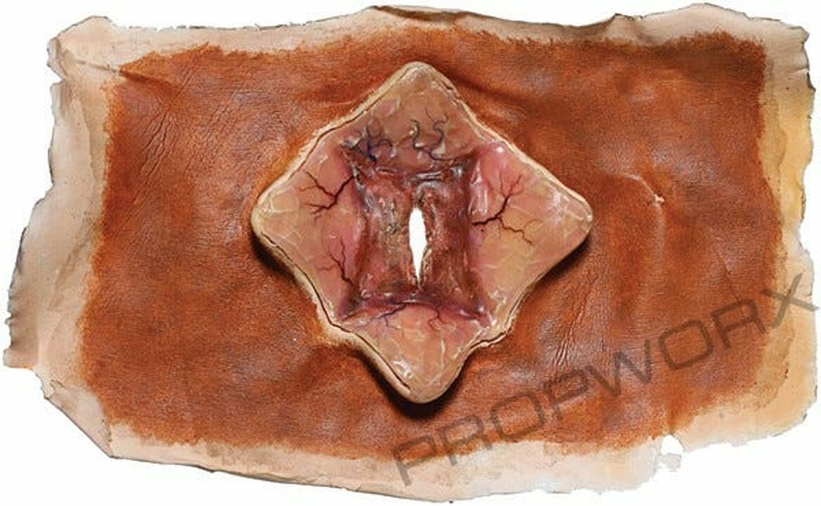 Produit en mousse en caoutchouc appareil stomacal avec des plis de la peau ouverte et l'ouverture au centre, peint brun et rose et décoré de fausses veines, mesures environ. 21 po x 13 po x 1,75 po.