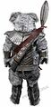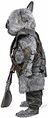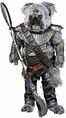 Production de corps en mousse dure recouverte de fausse fourrure pour simuler un animal. Comprend une tenue en caoutchouc composée de 9 pièces, une grande arme en mousse dure et une petite arme en résine. L'article est argenté, or, gris et noir avec des accents dorés et violets et est motorisé avec une bouche, des oreilles et des yeux mobiles, mais l'électronique n'est pas testée. Mesure 55po x 27po x 17po.